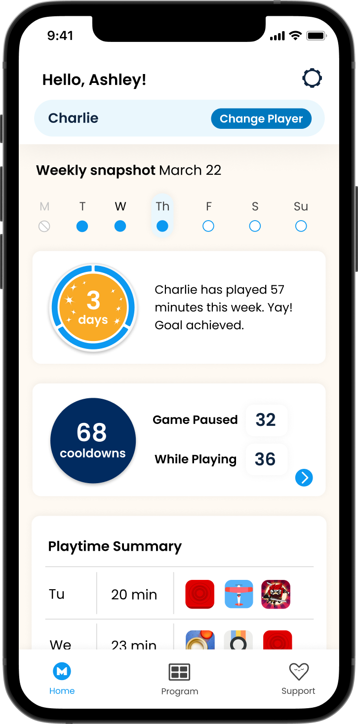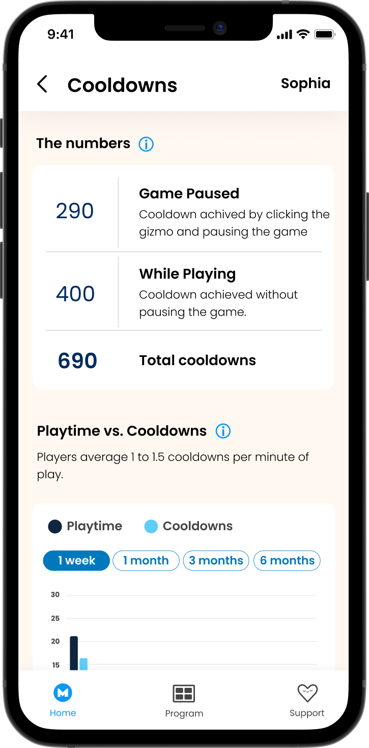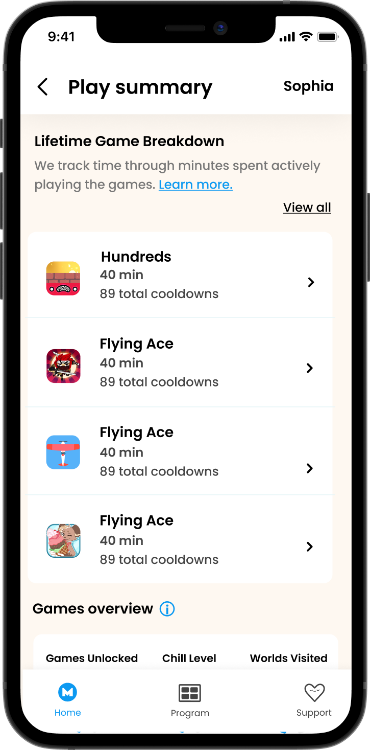 Understanding their child’s play builds connection. We built a lifetime game summary so parents could see what games their kids love and what games they haven’t played. Mightier has a library of 27 games, sometimes kids get bored when they haven’t tried all the games. Greater insight into the play for parents helps them be a better advocate for Mightier.