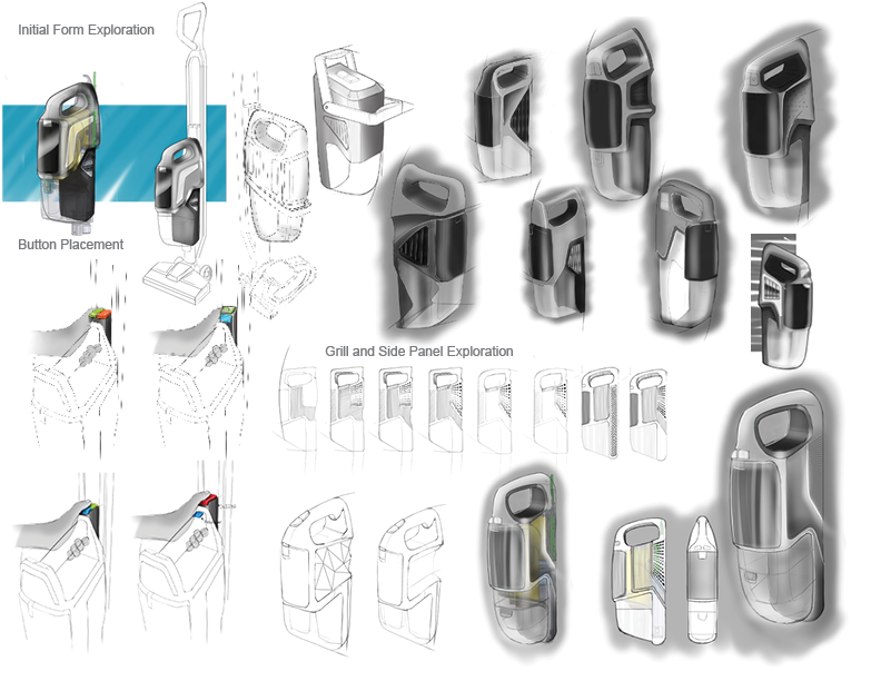 Based on user feedback from the initial prototype, buyers felt the vacuum looked too heavy to be use as a hand vac. I explored forms that softened the design language in an attempt to make the vacuum feel more approachable and easier to use.