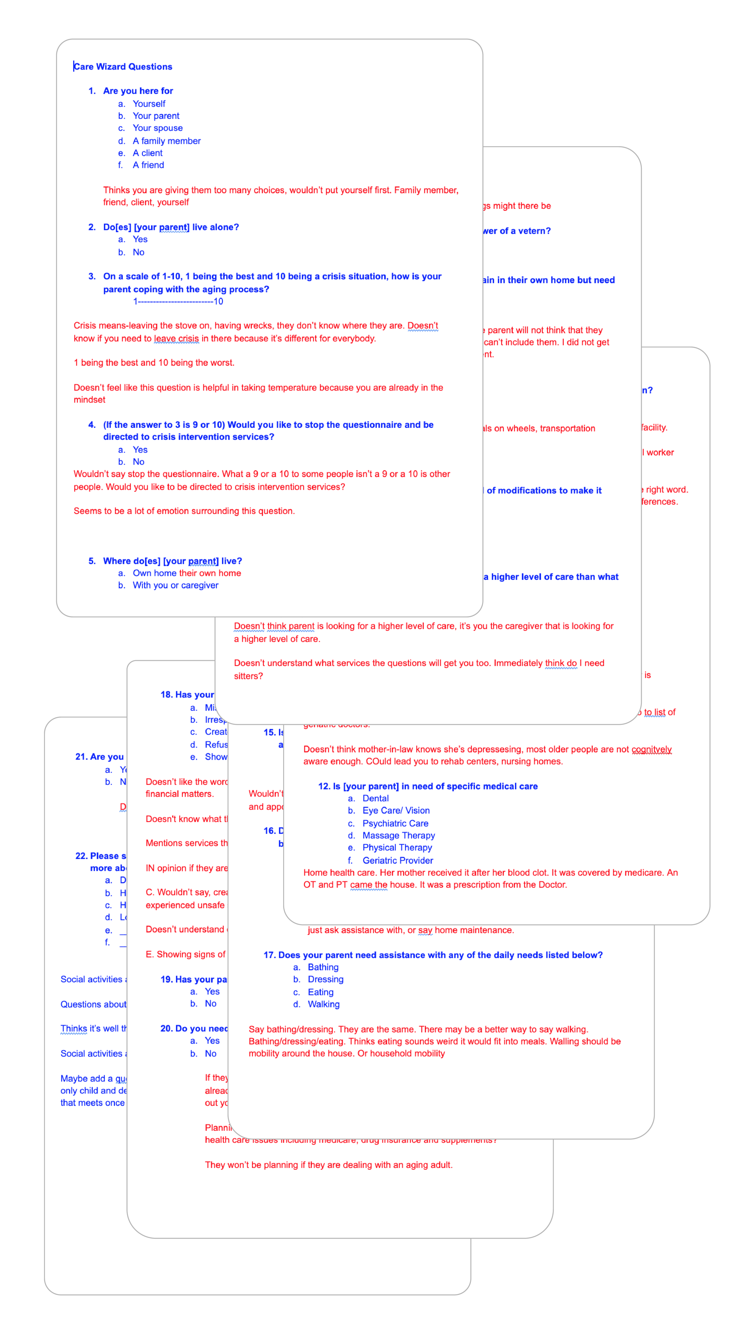 Starting with assessment questionnaires given by geriatric care managers, I created a rough draft of the care plan that I could test with. Through user interviews, secondary research and testing questions on geriatric care managers and individuals who would potentially use the feature, I arrived at comprehensive set of questions to move into prototyping.